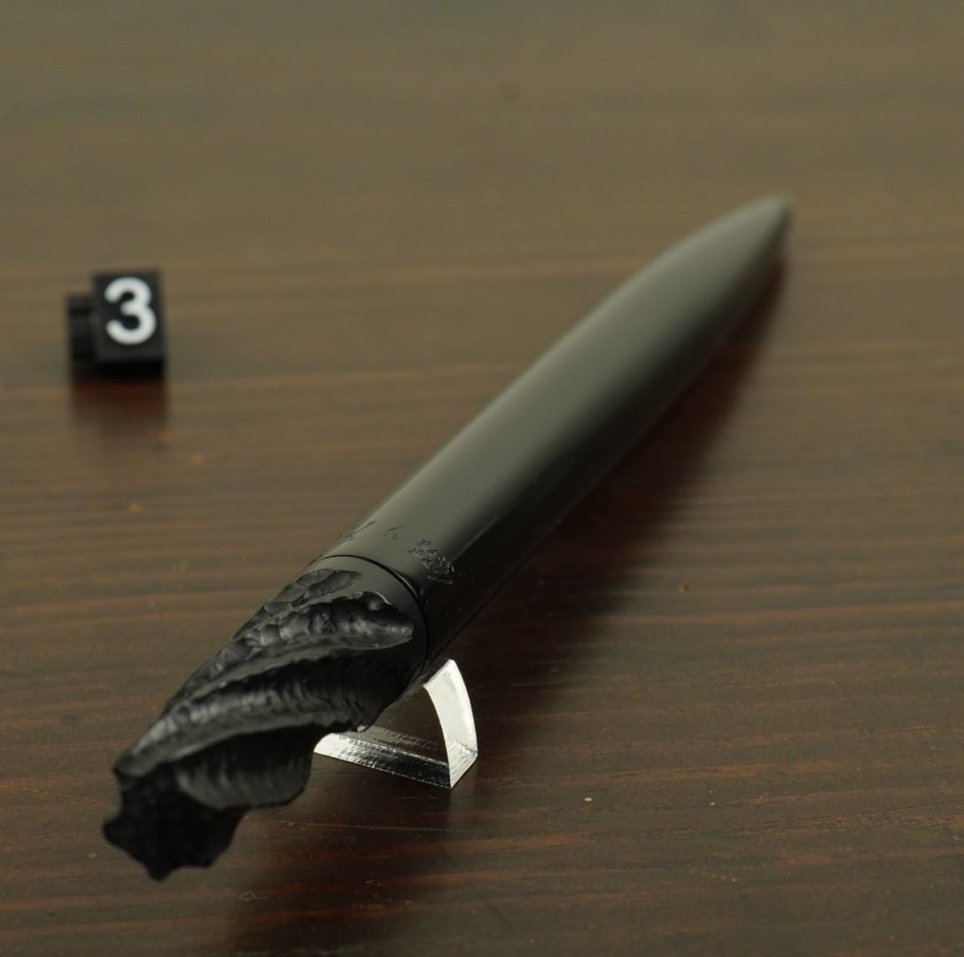 エボナイト ボディの エボナイト エンドに彫りを入れたボールペンです。HP初だしで、どのように説明すれば良いのかわからない。