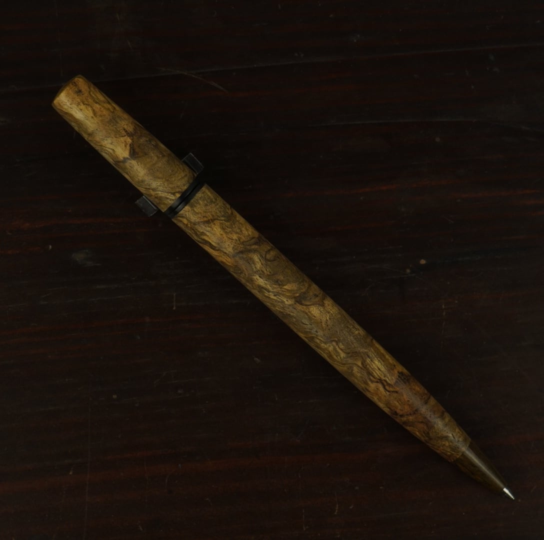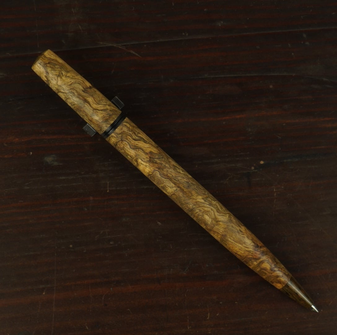 樹影...月灯からの造形のラインを引き継ぎ、木目の美しさを追求しました。一から内部構造を設計しました。...シンプルな外観はバティックマンゴーの複雑な木目の美しさを引き立てます。内部構造から設計、製作したボールポイントペンです。エンド部分を廻すとリフィルが出、筆記状態になります。ペン芯ギリギリまで追い込んだ先端はブレがなく書きやすいです。そのため精度の高いG2規格のリフィルだけを受け入れる。推奨リフィルは三菱のジェットストリームSXR-600-××