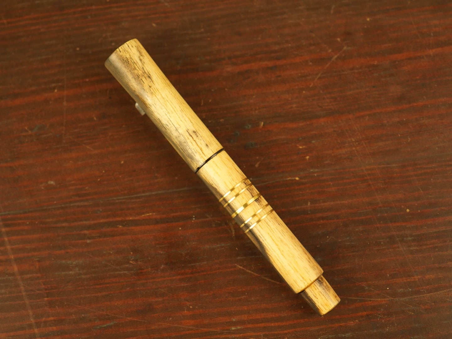 白黒の黒柿、黒の部分が輪っかのようになっていて表情があります。この太さでのボリューム感と存在感は手に触れるたびに魅入られ、持つ人の個性とも呼応し深淵を探られます。