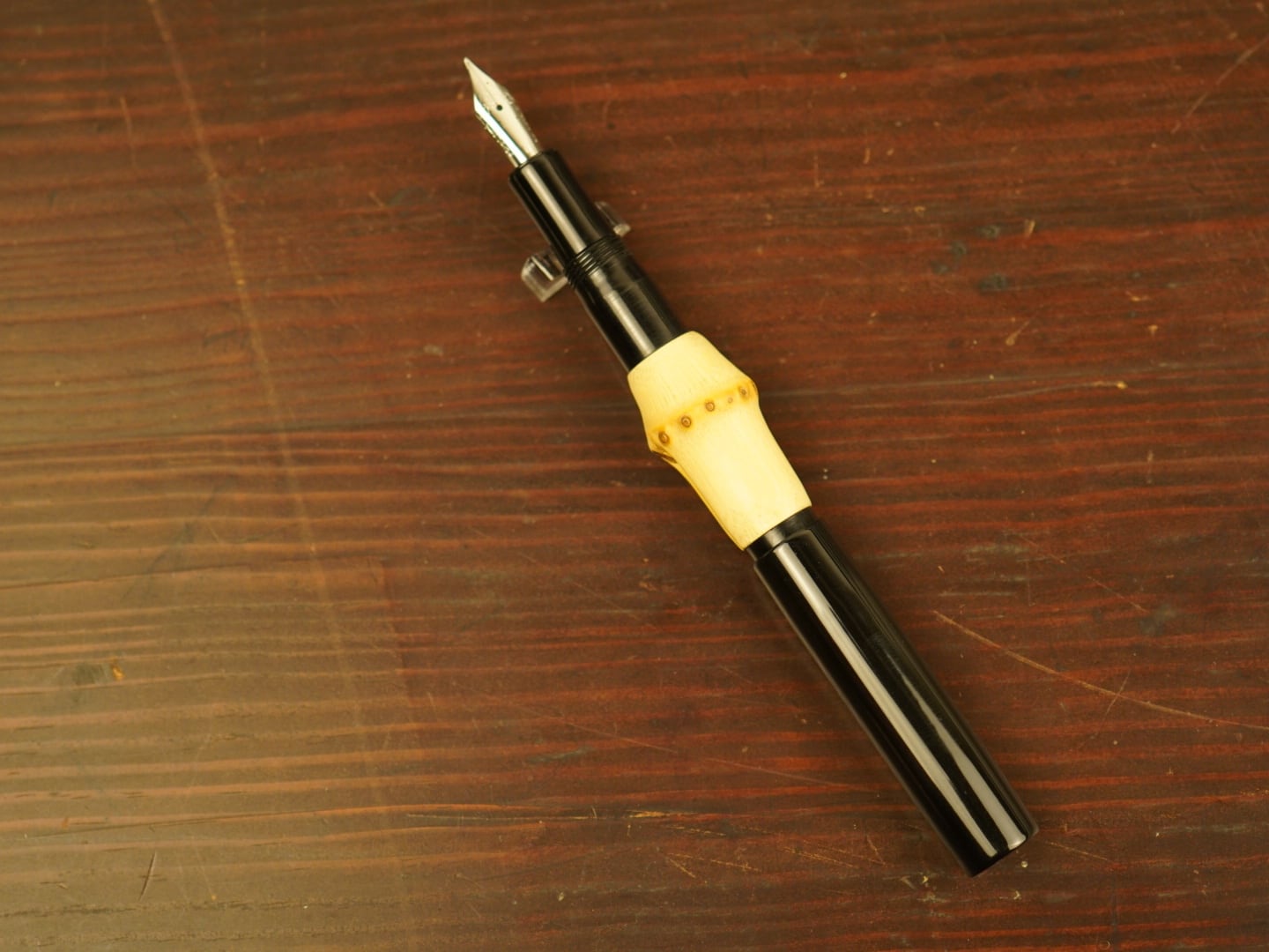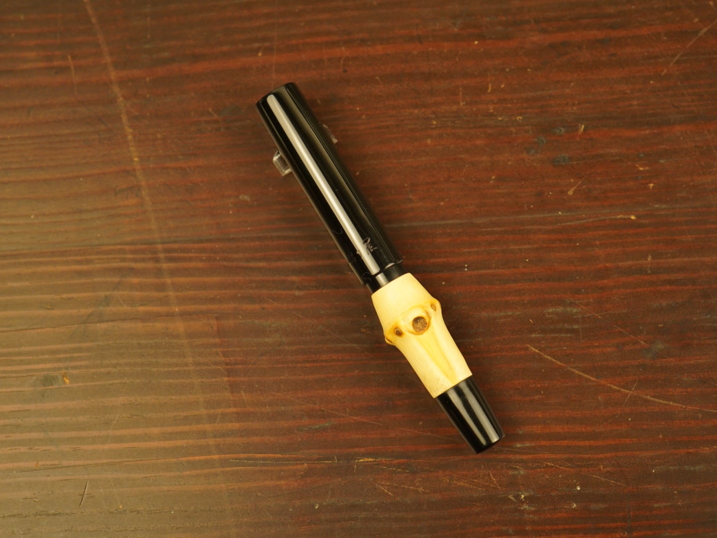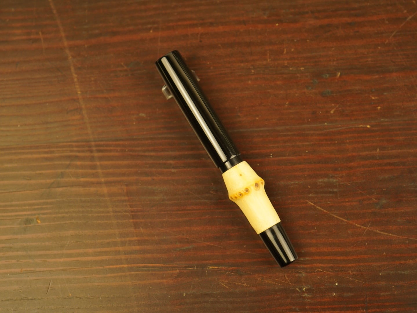 ブラックの部分はエボナイトを使用しております。エボナイトは1839年にグットイヤーが発明した半天然樹脂で、黒檀(エボニー)に似た外観からエボナイトと名付けられました。プラスチックではなく、天然ゴムの「硬質ゴム」に分類されます。エボナイトの優しい手触りは、人肌で冷たすぎず指に馴染む感触で、温かみのある触感が感じられます。変色対策として、カーボンを混入していただいています。