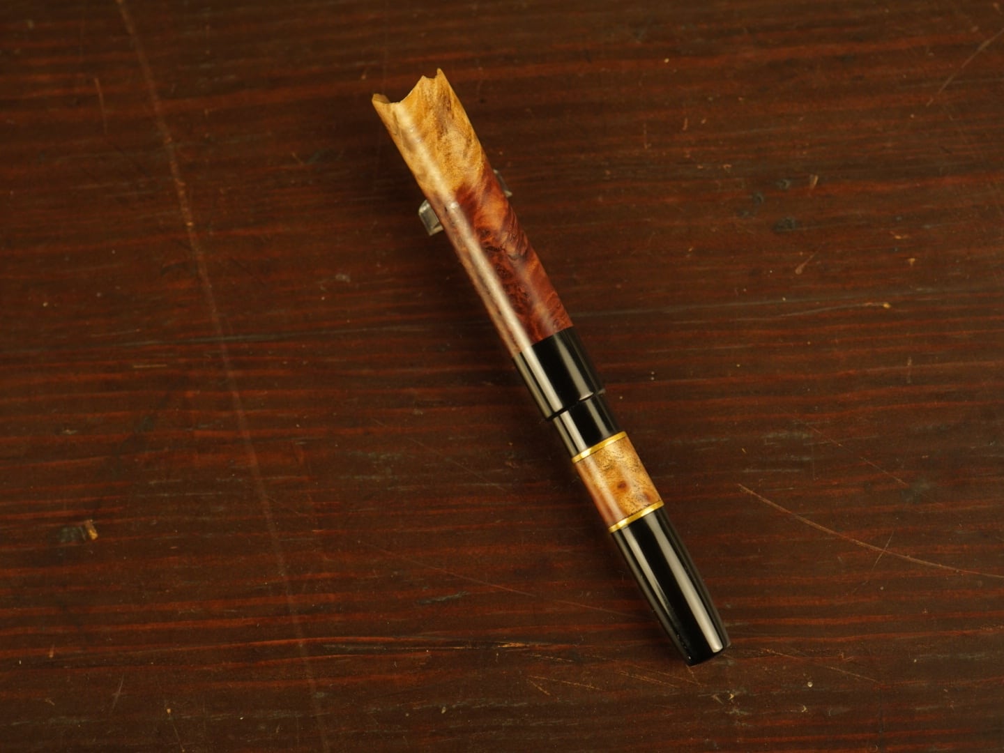 キャップ末端にブラウンマリー瘤の表皮側を用いることにより自然の面白さと多様性、王冠のような力強さを感じます。